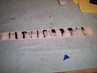 Today I removed all the tape and inspected my work. The bindings looked pretty nice and my miters were pretty nice. It is hard to cut a good miter on a curved piece of wood! I sanded the binding flush with the top and back of the fingerboard and then checked the fingerboard to see how level it was. It had a fairly good sized hump in the center which tapered down to the ends. I took some time with a level with sand paper on the edge try and get it level. It is pretty good now and is ready for frets. I am still on the fence on if I will install the frets before gluing the fingerboard to the neck, or wait until after the neck is on the guitar so I can get it perfectly leveled out before fretting. I like that idea because I can keep from removing much fret material during the setup, but I am a bit nervous about tapping frets in on a finished guitar. I am kicking both thoughts back and forth.
